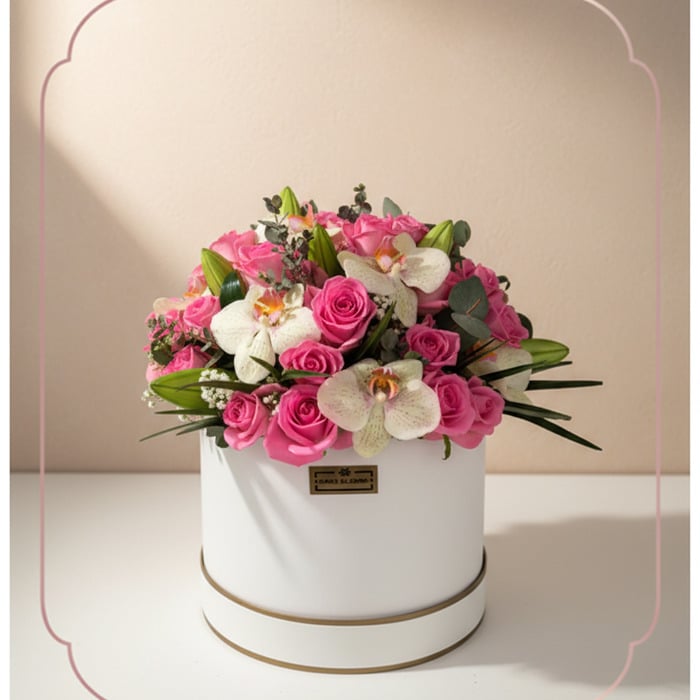 Arreglo Floral TANIA: Elegancia en Caja con Rosas y Orquídeas 🤍