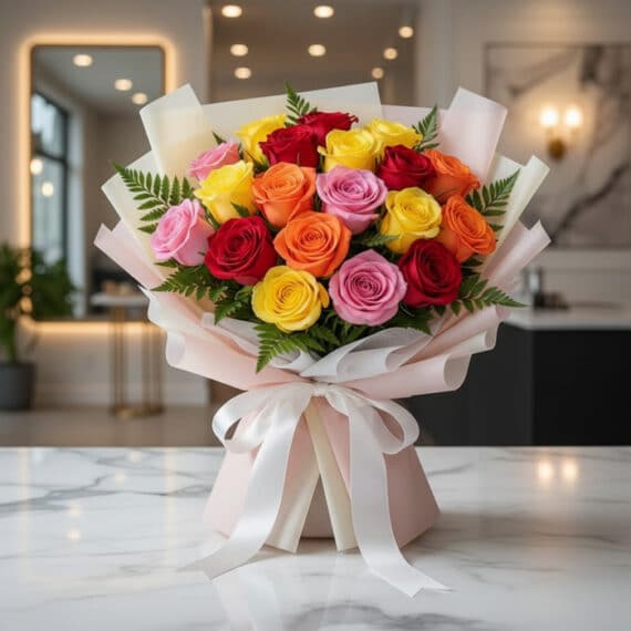Sorprende a ese ser especial, haz que este día se llene de color enviando este hermoso Ramillete o Bouquet de Rosas Multicolor con